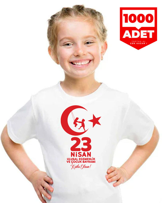 23 Nisan Baskılı Promosyon Çocuk Tişört - 1000 Adet - Beyaz - Tek Renk Baskı